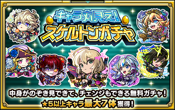 「キャラ丸見え!スケルトンガチャ」は、モニターに表示された排出候補の★5以上キャラクターを確認しながら、そのままガチャを引くか、キャラクターを入れ替えてガチャを引くかが毎日選べる無料シングルガチャ!