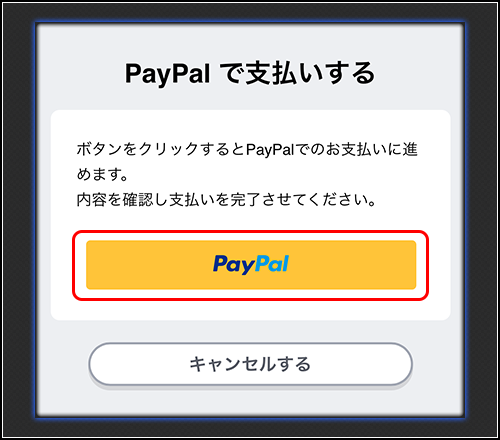 注文確認画面の「注文を確定する」をタップ後、PayPalのサイトの専用ボタンをタップすることで遷移します。