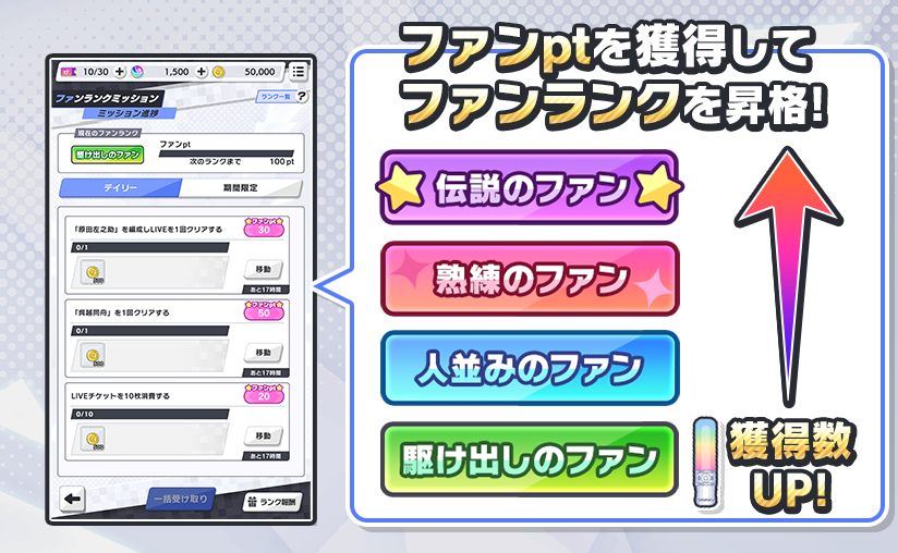 ミッションに挑戦して、「ファンランク」の昇格を目指そう!